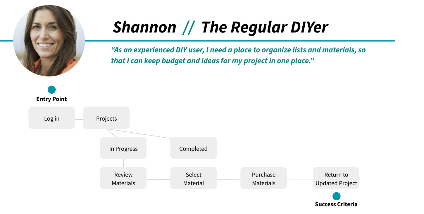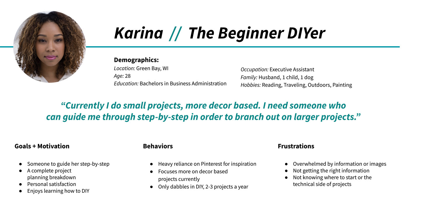 User personas were developed after the collection of user surveys and interviews. Two main personas emerged from the research lending the personas to a beginner DIYer and a more experienced DIYer. The majority of surveys and users interested were primarily women and all were homeowners.