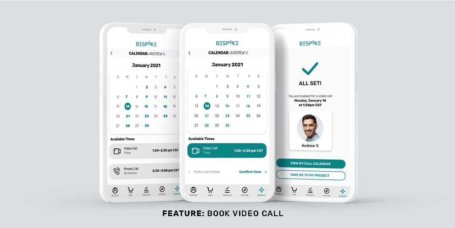 BESPOKE is an expert home improvement app that facilitates the organization needed to successfully tackle any Do-It-Yourself (DIY) home improvement project. Users can connect via live video, phone, or messaging features directly to a home improvement expert, allowing them to walk through their project safely and effectively for the best results.